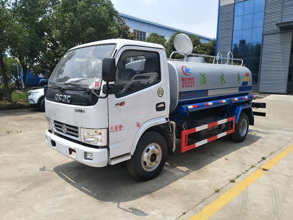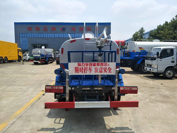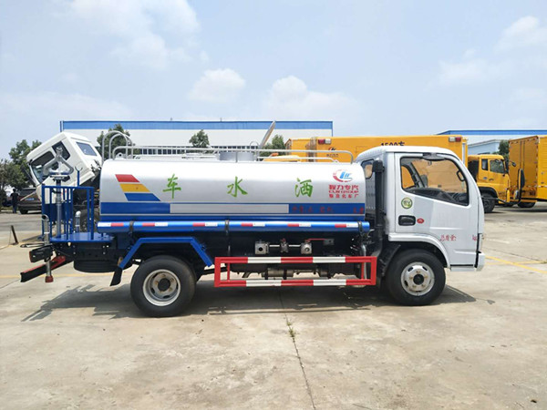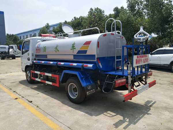 罐體容積為5立方灑水車,新款工藝罐體,厚度為4mm碳鋼Q235材質,罐內隔板具有防波作用,以減輕汽車行駛時罐體液體沖擊,罐體及整車外形尺寸按照公告。帶大功率專用灑水泵,泵可自吸自排,整車前沖、后灑、側噴、帶65消防接口,后平臺帶綠化灑水炮灑水炮可全方位旋轉,可連續調成直沖狀、大雨、小雨、毛毛雨;前封頭帶水位計,后平臺主管路帶1寸澆花接口,后爬梯。平臺后部帶小安全告知牌:“隨時停車,注意安全”,帶兩根水管及陰陽端。罐體顏色:上白/下藍,銀灰/銀藍,罐體兩側噴“灑水車、綠化灑水車”字樣,貼反光標示灑水車可加裝前沖后灑氣動閥駕駛室控制、可加裝霧炮機組發電機組噴霧降塵裝置、車頭可加裝推雪雪鏟、雪滾裝置街道、公路除雪等。